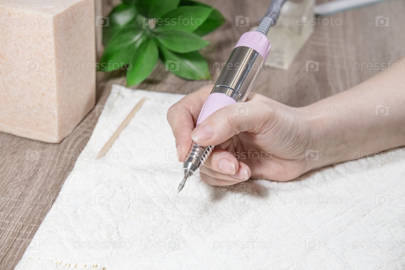Маникюрша с маникюрным станком использует электрическую дрель для ногтей в салоне красоты. Аппаратный маникюр. Процесс маникюра или операция крупным планом