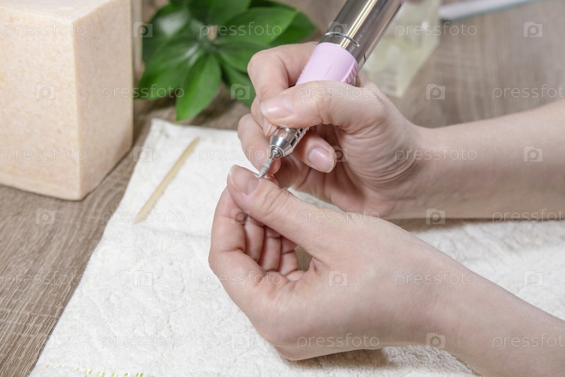 Женщина-маникюрша обрабатывает ногти и кутикулы или удаляет лак для ногтей с помощью маникюрной машины, использует электрическую дрель для ногтей в салоне красоты. Аппаратный маникюр. Процесс маникюра