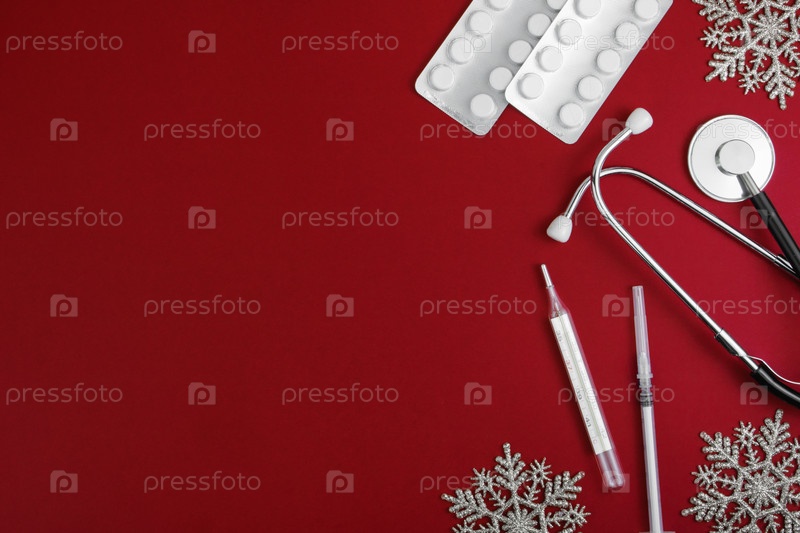 Медицинский рождественский фон. Стетоскоп, таблетки, волдырь, термометр и шприц, на красном фоне со снежинками. Баннер. категорически. Копировать пространство