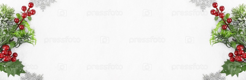 Рождественский фон. Ветка елки и снежинки на снегу. Концепция Рождества и Нового года. Баннер. Копировать пространство