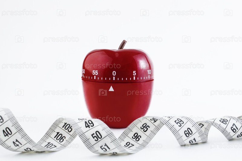 Красный кухонный таймер в виде красного яблока на белом фоне, возле измерительной ленты. Концепция здорового диетического питания. Копировать пространство