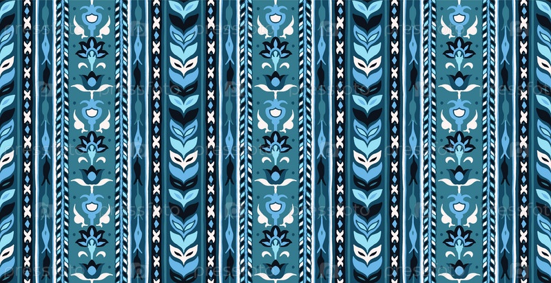 Геометрический дамасский орнамент. Икат границы. Этническая вышивка с листьями и монограммами. Племенная векторная текстура. Бесшовный народный узор в ацтекском стиле. Индийский, скандинавский, цыганский, мексиканский, африканский ковер