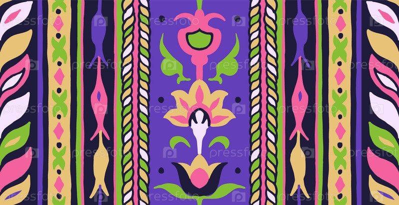 Геометрический дамасский орнамент. Икат границы. Этническая вышивка с листьями и монограммами. Племенная векторная текстура. Бесшовный народный узор в ацтекском стиле. Индийский, скандинавский, цыганский, мексиканский, африканский ковер