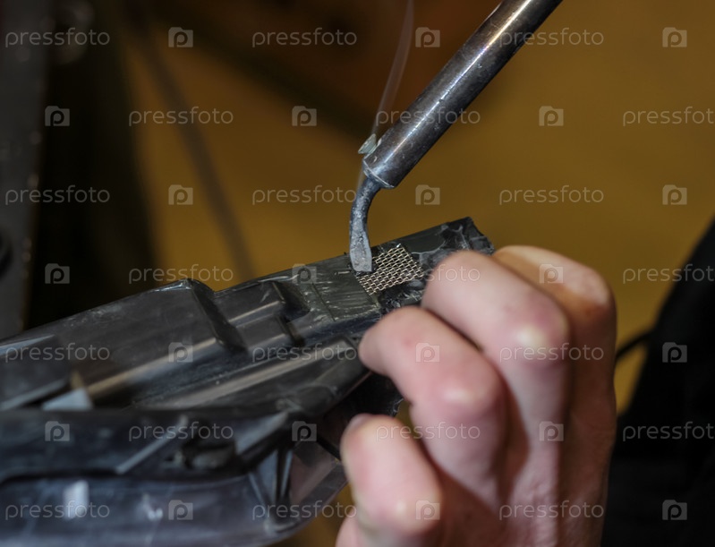 Мужчина восстанавливает пластик кузова автомобиля. У мужчины в руках паяльник, которым он паяет детали. Механик ремонтирует машину паяльником
