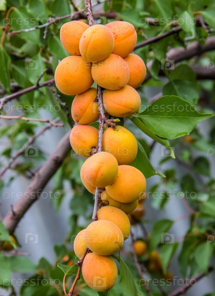 Спелые оранжевые абрикосы на ветке в саду в летний день крупным планом