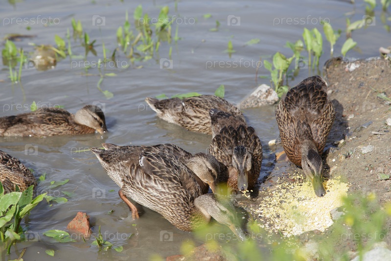 Утки и утята клюют корм на берегу реки. Люди кормят диких животных и птиц. Концепция жизни диких животных в городе. Голодные птицы