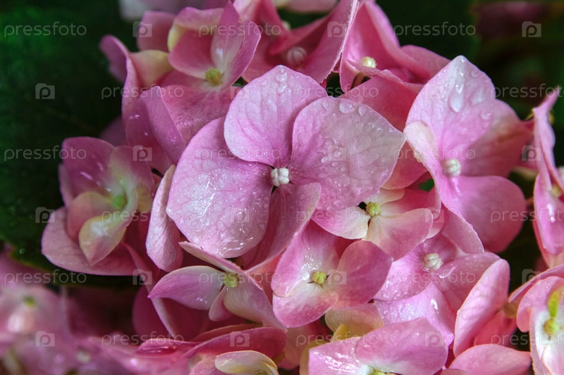 Розовые цветы гортензии с каплями воды крупным планом, концепция садоводства, поздравительная открытка и обложка, день матери, свадьба, день рождения и женский день
