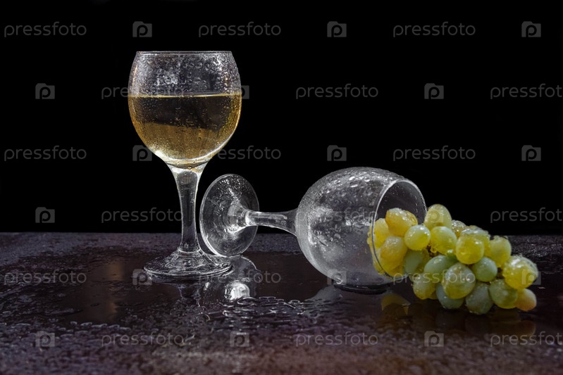 Два бокала вина и пустой лежат на столе с гроздью белого винограда и каплями воды на черном фоне