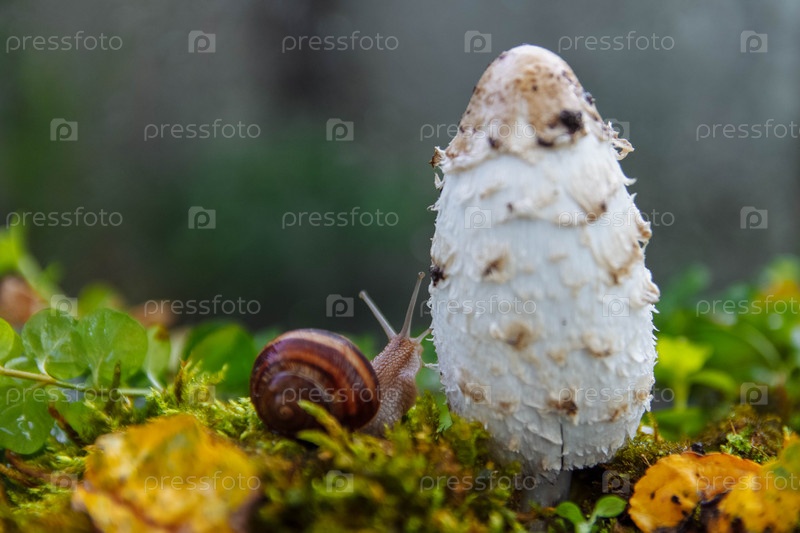 Большая коричневая улитка с антеннами ползет к белой грибной поганке в лесу на поляне с зеленым мхом и травой и опавшими желтыми листьями после дождя большой план с мягким фокусом