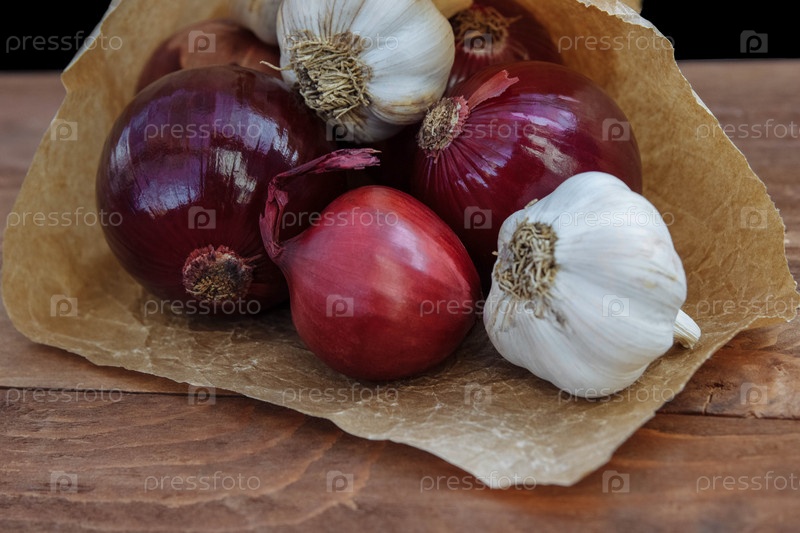 Красный лук и белый чеснок в бумажном пакете крупным планом на коричневом деревянном столе, концепция сбора органического урожая осенью, экологичность, витамины и иммунитет