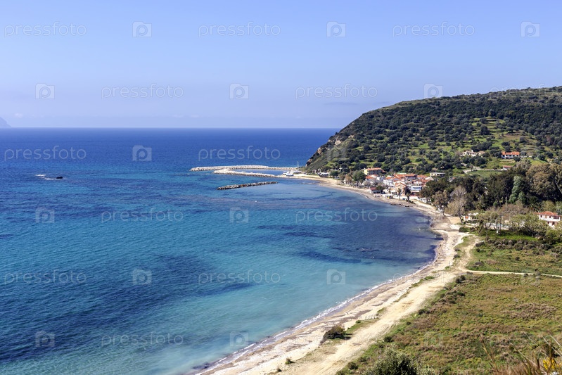 Вид на море, горы и приморский город (остров Кефалония, Греция) с высоты