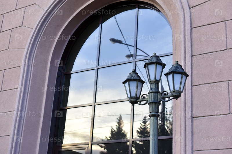 Квадратные декоративные уличные фонари на фоне окна. Красивые уличные фонари в городе