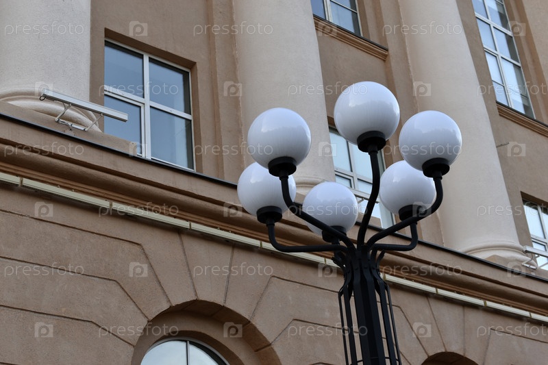 Круглые декоративные уличные фонари на фоне окна. Красивые уличные фонари в городе