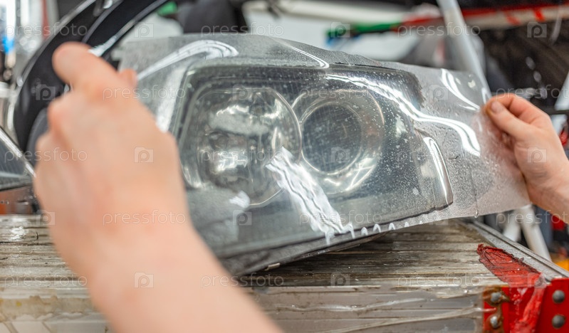 Процесс нанесения защитной пленки из полиуретана для защиты от щелей на стекло фар автомобиля. PPF Полиуретанная пленка, которая защищает стекло и металл от царапин