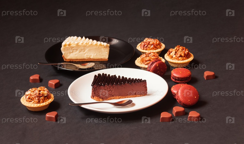 Чизкейки, миндальное печенье, торты с грецкими орехами и шоколадные конфеты на темном фоне. Выборочный фокус