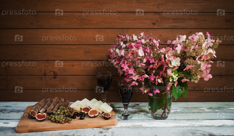 Осенние цветы гортензии, красное вино, инжир, сыр, виноград, хлеб и маслины. Тонированное изображение