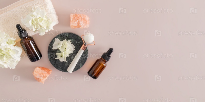 Натуральный уход за кожей лица и тела. Два флакона косметики и роликовый массажер на подиуме из темного мрамора. Вид сверху. баннер. Копия пространства