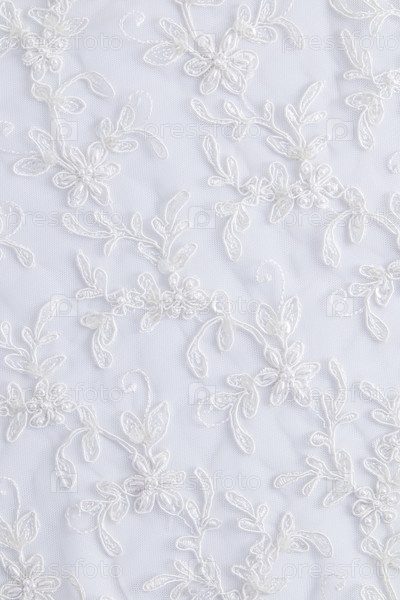 Вертикальный вид из шикарной вышитой белой атласной ткани. цветы вышитые бисером и пайетками. Свадебный праздничный фон