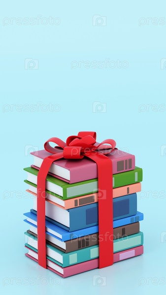 Книги в подарок, книги, перевязанные лентой с бантом, вертикальный баннер с пустым пространством наверху - 3D-рендеринг