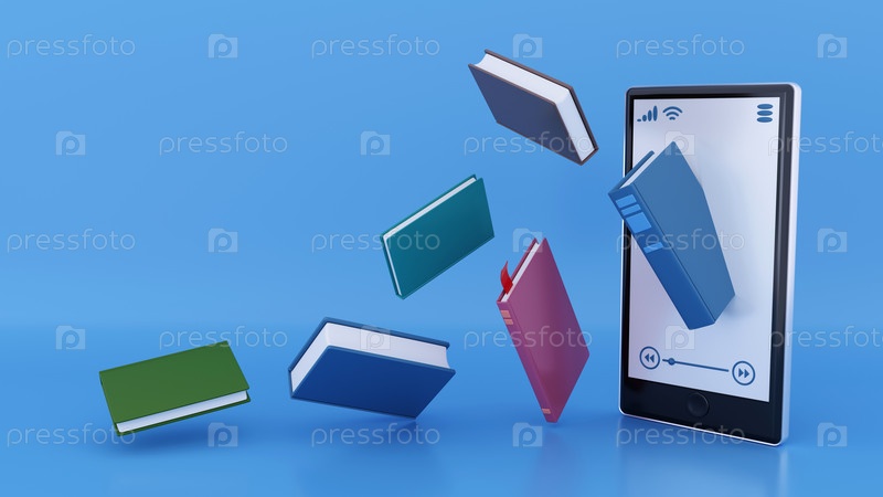 Книга вырывается из телефона, иллюстрация устройства для чтения электронных книг, реклама или фон для баннера книжного магазина - 3D-рендеринг