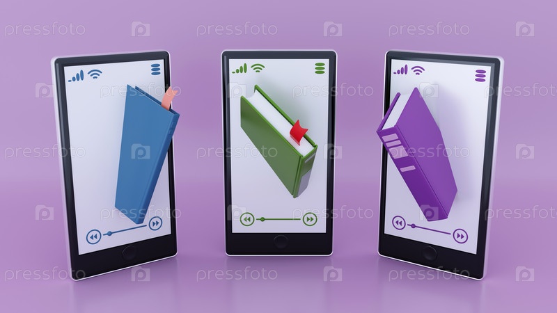 Книга вырывается из телефона, иллюстрация устройства для чтения электронных книг, реклама или фон для баннера книжного магазина - 3D-рендеринг
