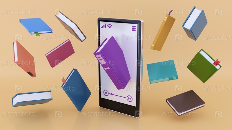 Книга вырывается из телефона, иллюстрация устройства для чтения электронных книг, реклама или фон для баннера книжного магазина - 3D-рендеринг