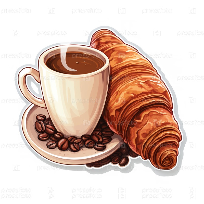 Кружка кофе с круассаном на белом фоне. Генеративный ИИ