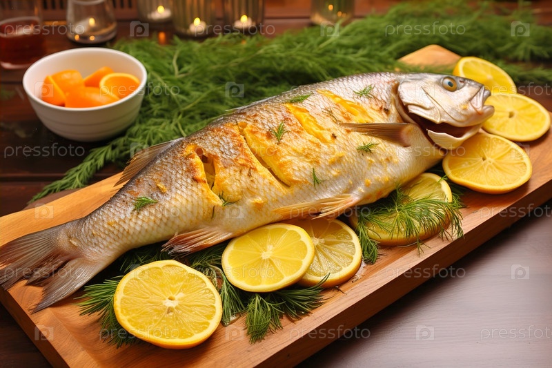 Запеченная рыба с лимоном. Подача блюд от шеф-повара. Генеративный ИИ