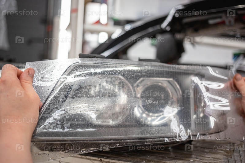 Процесс нанесения защитной пленки из полиуретана для защиты от щелей на стекло фар автомобиля. PPF Полиуретанная пленка, которая защищает стекло и металл от царапин