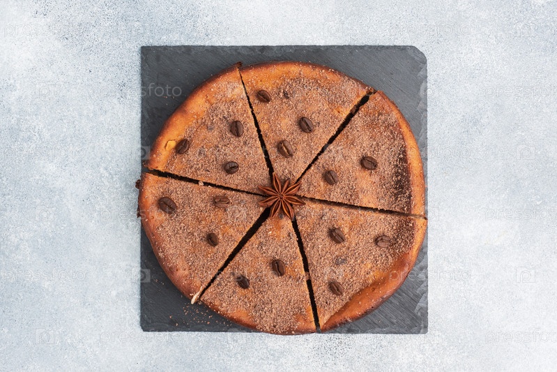 Запеканка из шоколадного творога, целый пирог на подставке, вид сверху, место для копирования