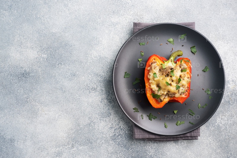 Сладкий перец, фаршированный рисовыми грибами и сыром с зеленью. Запеченные половинки красного перца с начинкой. Серый бетонный фон. Копировать пространство,