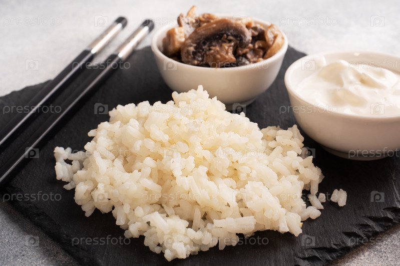 Отварной белый рис и грибы в сметане на черной подставке с палочками. Серый бетонный фон крупным планом