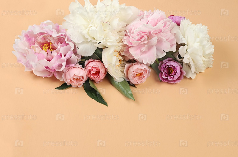 Абстрактная цветочная композиция из пионов и роз на пастельном фоне с местом для текста, летний баннер для рекламы, минимальная праздничная концепция с цветами, поздравительная открытка на свадьбу, день рождения, день матери, выборочный фокус