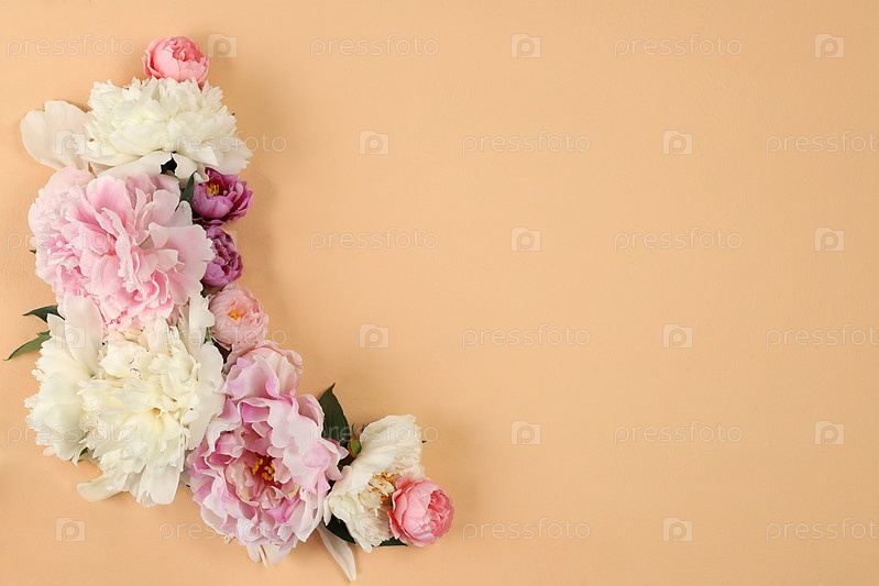 Абстрактная цветочная композиция из пионов и роз на пастельном фоне, шаблон для дизайна и летний баннер для рекламы, минимальная концепция праздника с цветами, поздравительная открытка на свадьбу, день рождения, день матери, избирательный фокус