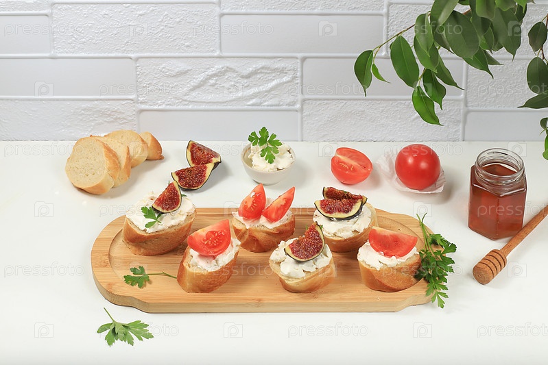 Здоровый завтрак с ингредиентами, тост с инжиром, помидорами и мягким сливочным сыром и медом, канапе или кростини с жареным багетом и зеленью на светлом солнечном столе, меню итальянских рецептов, выборочный фокус