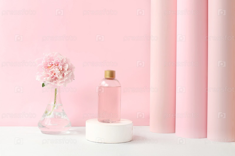 Спа и велнес-композиция с ароматной розовой водой и цветами пиона и розы на элегантном фоне премиум-класса, ароматерапия и уход за кожей, образ жизни и концепция органической косметики, избирательный фокус