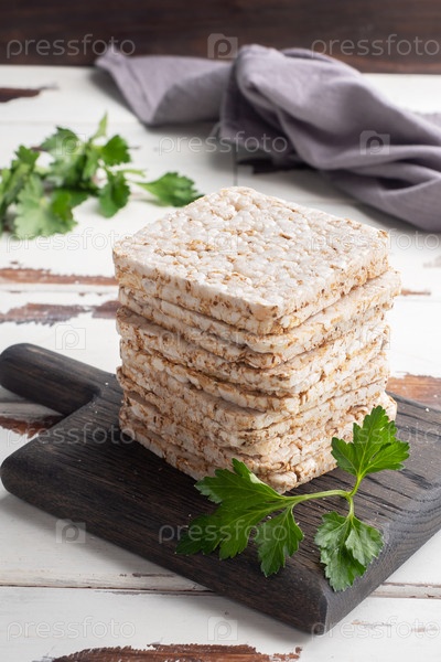 Полезный перекус Хрустящие хрустящие хлебцы с листьями свежей петрушки. Деревянный фон, пространство для копирования