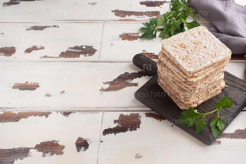 Полезный перекус Хрустящие хрустящие хлебцы с листьями свежей петрушки. Деревянный фон, пространство для копирования