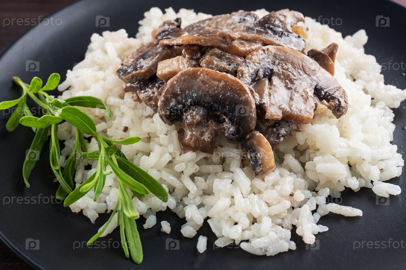 Ризотто с грибами на черной тарелке. Отварной белый рис с шампиньонами в сливочном соусе. Темный деревянный фон. крупным планом