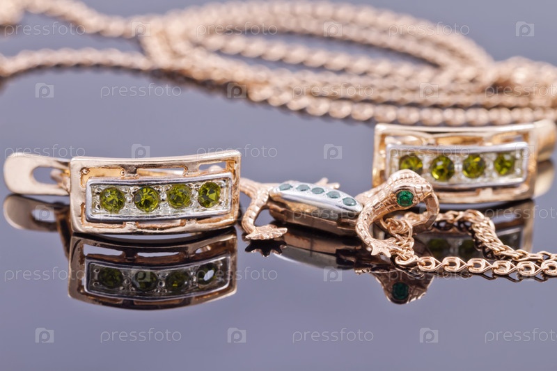 Золотые серьги с изумрудной лейкой и кулоном в виде ящерицы