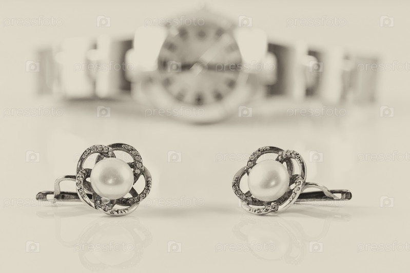 Серебряные серьги с жемчугом на фоне часов