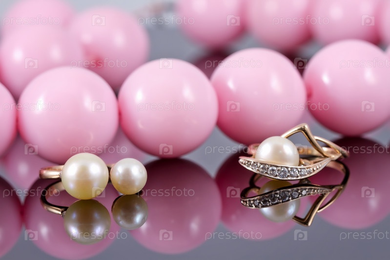 Крупные розовые бусы и набор золотых украшений с жемчугом