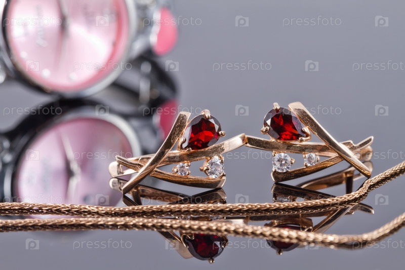 Золотые серьги с рубинами и элегантные женские часы