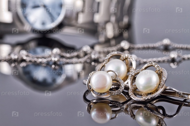 Комплект серебряных украшений с жемчугом и женских часов