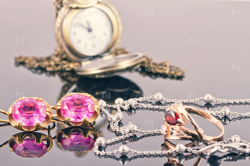 Набор золотых украшений с рубинами и старинными медными карманными часами
