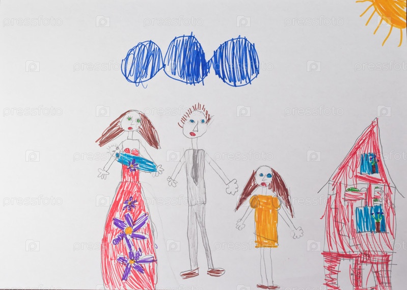 Детский рисунок, на котором изображена счастливая семья с детьми