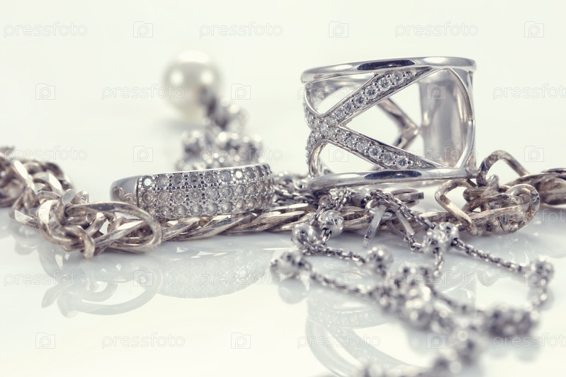 Серебряное кольцо с драгоценными камнями и тонкой серебряной цепочкой