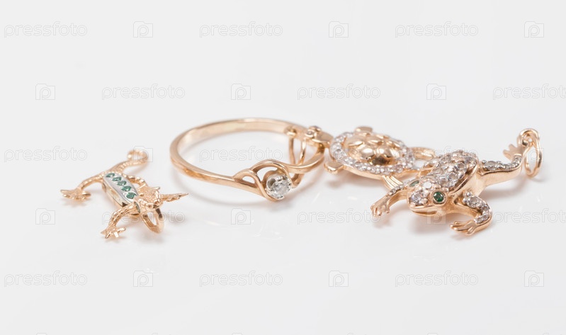 Золотая подвеска в виде черепашек, ящериц и лягушек сочетается с кольцом с бриллиантом