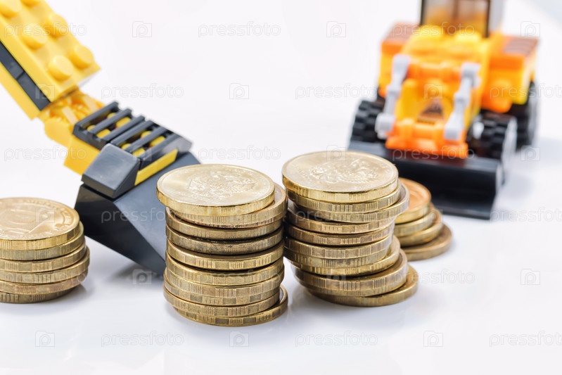Игрушечный бульдозер собирает кучу золотых монет в кучу