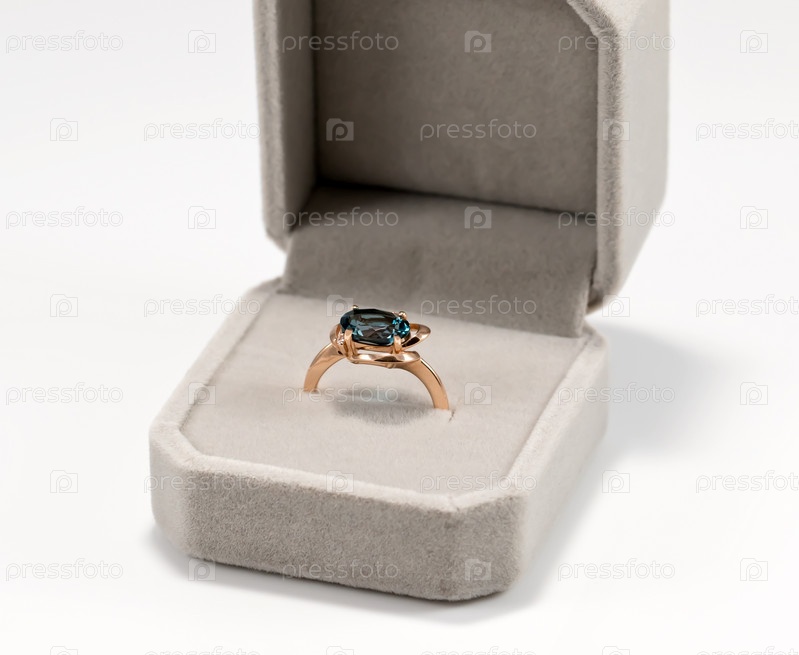 Золотое кольцо с голубым топазом в бархатной подарочной упаковке